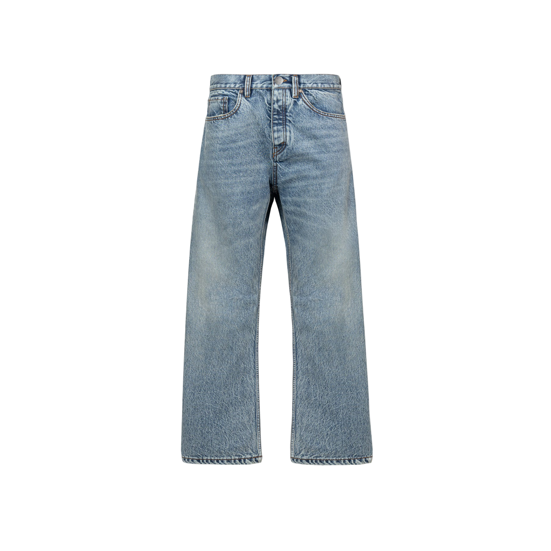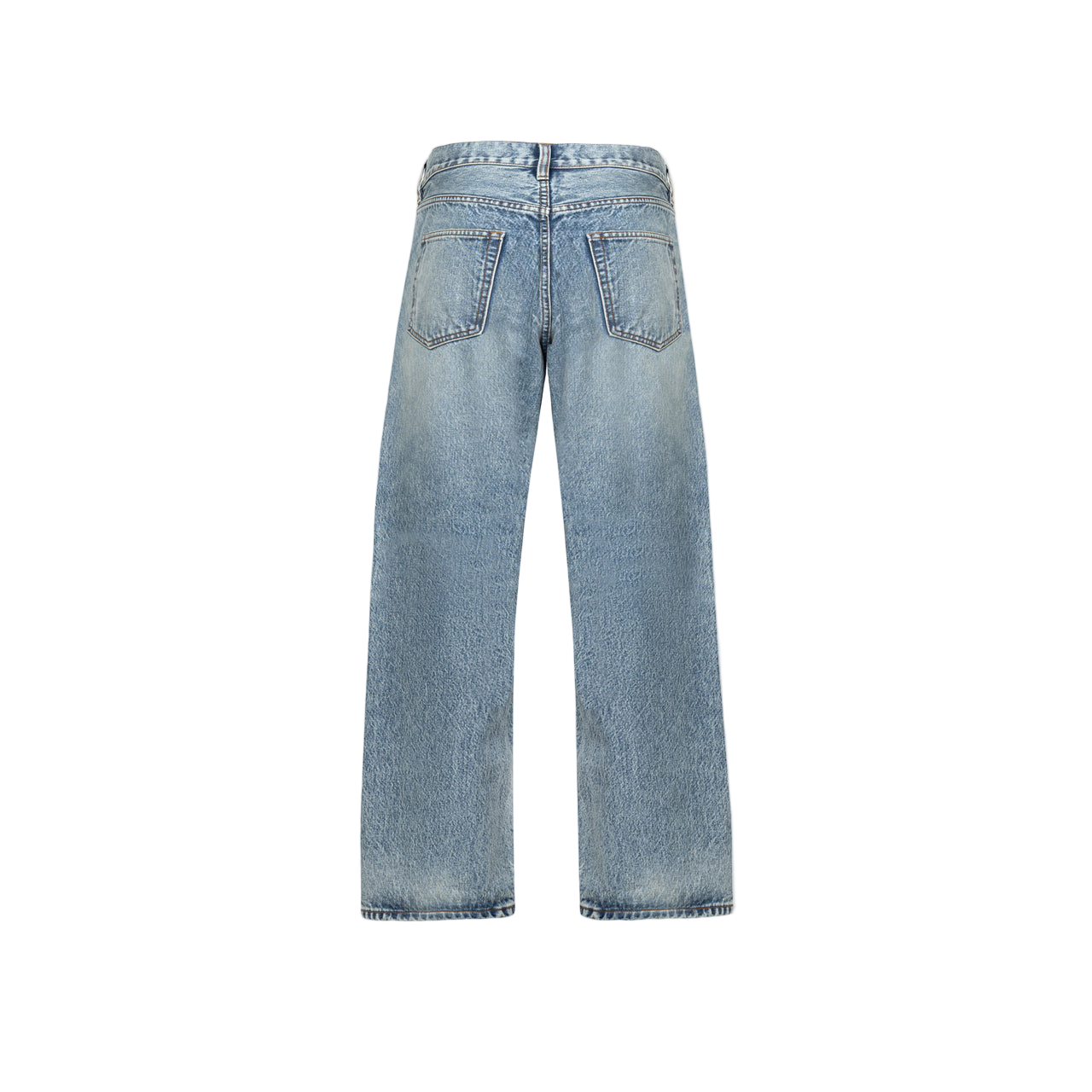 Cut from 100% certified organic cotton, these jeans are structured yet breathable with a mid-to-high rise, loose fit, and wide-leg cut that moves with ease. The washed blue fade gives them a vintage, lived-in finish, while the 5-pocket construction and button fly retain classic denim DNA.